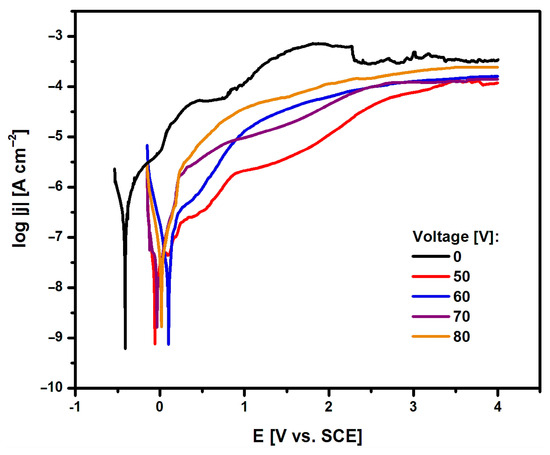 The susceptibility of the Ti G4 electrode to pitting corrosion in ASS containing aggressive chloride ions at a temperature of 37 °C was tested in the initial state, i.e., after mechanical polishing (0 V) and after anodizing at a voltage of 50–80 V for 60 s in 0.5% silver nitrate solution based on anodic polarization curves. During the measurement, the change in the potential of the tested electrodes was recorded using an electrode polarization rate of v = 1 mV s−1. The recorded anodic polarization curves are presented in the semi-logarithmic form log|j| = f(E) in Figure 7.