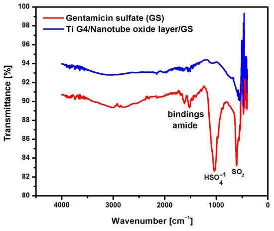 ATR-FTIR absorption spectrum obtained for gentamicin sulfate (GS) powder and Ti G4 sample with a layer of oxide nanotubes produced by anodization in 0.5% AgNO3 solution at 80 V for 60 s with implemented GS.