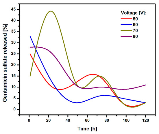 In the first hours, the drug was intensively released from the inside of the oxide nanotubes. In the case of the longest oxide nanotubes obtained at 50 V, approximately 25% of the drug was released in the first hour. In the case of nanotubes obtained at 60 and 80 V, the initial amount of drug released was approximately 25%. Oxide nanotubes obtained at 70 V showed a strong drug release from their interior of 45%. Nanotubes obtained at 50, 60, and 70 V showed a dynamic course in the subsequent hours of release, with an upward trend in drug release between hours 60 and 80 of the study. Nanotubes obtained at 80 V showed a constant therapeutic dose level from the 50th hour of release. This nature of drug release is related to the regular arrangement of the resulting nanotubes having a honeycomb structure. The obtained nanotubes were fully formed, which allowed the drug to penetrate evenly into the nanotubes. The gentamicin sulfate was released from the interior of the oxide nanotubes in accordance with Fick’s first law, which states that the amount of drug diffusing per unit time through the surface perpendicular to the direction is directly proportional to the area of this surface and the concentration gradient of the drug in the system [44].