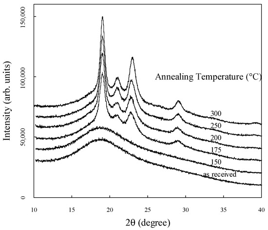 Figure 2 shows the WAXRD diffractograms measured from 5° to 40° for each annealing temperature. The diffractograms are shown on the same scale and are vertically shifted to show them more clearly. Sharp peaks are observed at 2θ values of approximately 19°, 21°, 23°, and 29°, corresponding to the 110, 111, 200, and 211 planes, respectively [34]. The broad peak observed at approximately 19° is associated with the amorphous structure. In the as-received sample without annealing, no crystallinity peak is observed, similar to previous studies [14,35]. The crystallinity was determined by fitting each obtained WAXRD spectrum to separate sharp peaks due to crystallinity and broad peaks due to the amorphous structure of the Lorentzian and Gaussian functions, respectively.