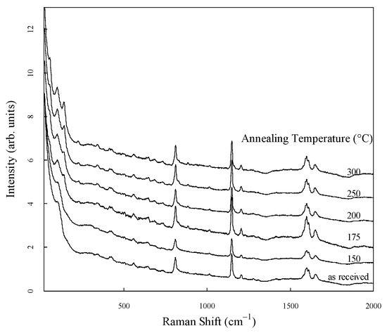 The Raman spectra of PEEK, standardized in the range of 40 cm−1 to 2000 cm−1, are shown in Figure 3. For clarity, the spectra are shown to be vertically shifted. Several strong peaks are observed in the low- and mid-frequency regions of all spectra. The origins of the peaks in the mid-frequency region have been identified in previous studies [19,20,21,22] and have been summarized in a recent report [14].