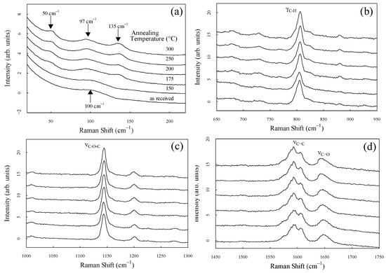 Enlarged spectra of each region are shown in Figure 4a–d to observe the spectral shape in more detail. Each spectrum was standardized in the area displayed on the horizontal axis. Figure 4a shows the peaks at 50 cm−1, 97 cm−1, and 135 cm−1 in samples annealed at temperatures above 175 °C. In our previous study, we reported that the peak at 135 cm−1 was significantly related to crystallinity and associated with intermolecular vibration modes [24,33]. The peak at 50 cm−1, which is markedly dependent on the degree of crystallinity, similar to the peak at 135 cm−1, is observed for the first time. Crystallinity dependence has been reported for various peaks in the mid-frequency region, such as the peak center at 1644 cm−1, intensity ratio of 1597 cm−1 and 1607 cm−1, intensity ratio of the bands at 800 cm−1 and 810 cm−1 [19], and center frequency at 1146 cm−1 [36] and 1651 cm−1 [14]. Similarly, the peaks at 50 cm−1 and 135 cm−1 in the low-frequency region are highly sensitive to crystallinity. Furthermore, the peaks at 50 cm−1 and 135 cm−1 completely disappeared in the sample with zero crystallinity.