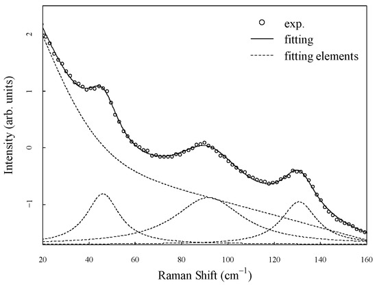 The Raman spectra in the low-frequency region were decomposed into peaks at 50 cm−1, 97 cm−1, and 135 cm−1 expressed by a Lorenz function, a Gaussian function, and a linear function as the baseline data. The Lorenz function can be characterized based on the intensity, half-width at half maximum, and center frequency. The Gaussian function represents the background with a center frequency of 0 cm−1, and the half-width at half maximum and intensity are used as fitting parameters. Each parameter was independently adjusted to achieve the minimum chi-square value using the Levenberg-Marquardt nonlinear least-squares optimization. A sample fit of the Raman spectra is shown in Figure 5.