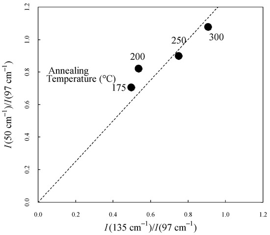 Figure 6 shows the intensity ratio between 50 cm−1 and 97 cm−1 () and between 135 cm−1 and 97 cm−1 (). The dashed line demonstrates the good correlation of the parameters. Both values increased with increasing crystallinity. Along with the disappearance of the peaks in the amorphous state, this result suggests that the two peaks were influenced by the intermolecular order through the same mechanism.
