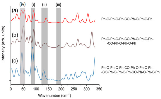 Simulations were performed to clarify the origin of the peak at 50 cm−1. Figure 7 shows the Raman spectra calculated using DFT. Figure 7, which was modified from previous work Ref. [28], shows the spectra of PEEK oligomers with different lengths, terminated with phenyl groups. Peaks (i)–(iii) in the gray-shaded region are described in previous work [33]. Figure 8 shows the atomic motion in the vibrational modes at approximately 50 cm−1 (peak (iv)) calculated for a single oligomer molecule using DFT. The peak at 50 cm−1 is ascribed to the twisting motion of the ketone and connected benzene rings (Ph-O-Ph), similar to the peak at 135 cm−1 (peak (ii)). MD simulations were performed using LAMMPS. The simulation video is provided as Supplemental Video S1, whereby the time interval corresponds to 50 cm−1. The peaks at 50 cm−1 and 135 cm−1 are associated with Ph-CO-Ph-type intermolecular vibrational modes. Ketone groups have high polarity; therefore, the ketone group plays a major role in molecular interactions. Moreover, the peaks at 50 cm−1 and 135 cm−1 are not observed in the amorphous state and are sensitive to crystallinity. They are related to ketone groups, which are strongly related to the intermolecular order.