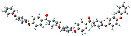 Atomic motion in the vibrational modes at 50 cm−1 calculated for a single oligomer molecule using DFT. The white, red, and gray spheres represent hydrogen, oxygen, and carbon, respectively. The blue lines show the direction of the movement of the atom, and their lengths show the magnitude of the displacement.