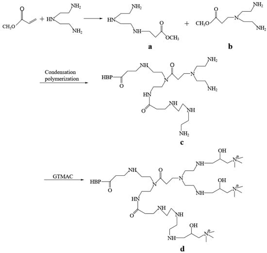 HBP-HTC was prepared by the methodology delineated in the literature [16], as shown in Figure 1. The brief preparation process is as follows: Under a nitrogen atmosphere, a mixed solution of methyl acrylate and methanol was added dropwise to diethylenetriamine. After the reaction, a pale-yellow, transparent AB3 and AB2 monomer was obtained (Figure 1a,b). After the removal of the methanol, the temperature was raised to 150 °C, and the reaction continued under reduced pressure to yield a viscous, pale-yellow, amine-terminated hyperbranched polymer, HBP-NH2 (Figure 1c). This compound was dissolved in water, and an aqueous solution of 2,3-epoxypropyltrimethylammonium chloride was added dropwise. Once the reaction was complete, the product was separated and purified to yield a pale-yellow, solid HBP-HTC (Figure 1d).