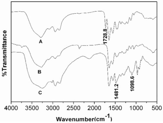 Figure 2 presents the FTIR spectra of the AB3 and AB2 monomers (1 and 2), HBP-NH2, and HBP-HTC. The IR spectra of the three compounds exhibit a high degree of similarity, with a notable distinction being the appearance of a distinctive absorption peak at 1728.8 cm−1 for the carbonyl (C=O) group in the IR spectra of the AB3 and AB2 monomers [27], which is absent in the FTIR spectrum of HBP-NH2. This suggests that the ester bonds in the AB2 monomer fully reacted with the amine or imine groups to form amide bonds, confirming the synthesis of HBP-NH2. In the FTIR spectrum of HBP-HTC, peaks at 1481.2 cm−1 and 1098.6 cm−1 correspond to the characteristic absorption bands of δC-H for the -CH3 group and νC-OH for the secondary hydroxyl group in the quaternary ammonium salt side chain, respectively [16,28].