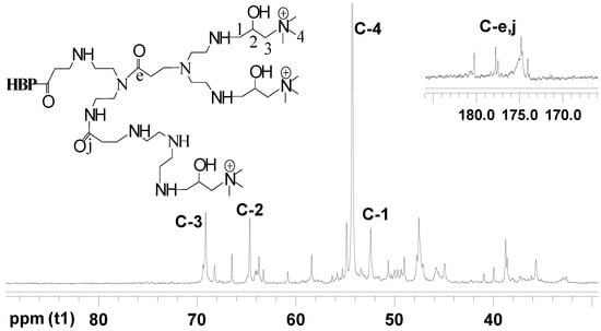 Figure 5 and Figure 6 illustrate the 13C NMR spectra of HBP-NH2 and HBP-HTC, respectively. Although the grafting reaction complicates the 13C NMR spectrum of HBP-HTC, it is clear that the peaks at δ = 52.414, 64.007, and 69.397 ppm correspond to the C1, C2, and C3 carbons of the quaternary ammonium salt side chain, respectively. The peak at δ = 54.286 ppm corresponds to the three methyl carbons C4 attached to the nitrogen of the quaternary ammonium salt [29]. Based on the analysis of the aforementioned infrared spectroscopy and nuclear magnetic resonance spectroscopy, it can be inferred that a hydroxypropyl trimethylammonium chloride side chain was introduced onto the nitrogen in HBP-NH2, yielding the quaternary ammonium salt HBP-HTC.