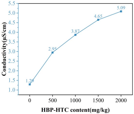 Figure 7 illustrates that as the content of HBP-HTC increases, the electrical conductivity of the spinning solution gradually increases, but the rate of increase diminishes. When the HBP-HTC content reaches 2000 mg/kg, the conductivity is 5.09 µS/cm. It is known from the literature [7] that fibers do not exhibit branching phenomena when the spinning solution’s electrical conductivity is around 6 µS/cm. In this experiment, the highest conductivity of the spinning solution was only 5.09 µS/cm. It can be seen that within the current range of the HBP-HTC content, its impact on the performance of the spinning solution is not significant, which is conducive to enhancing the stability of the electrospinning process.