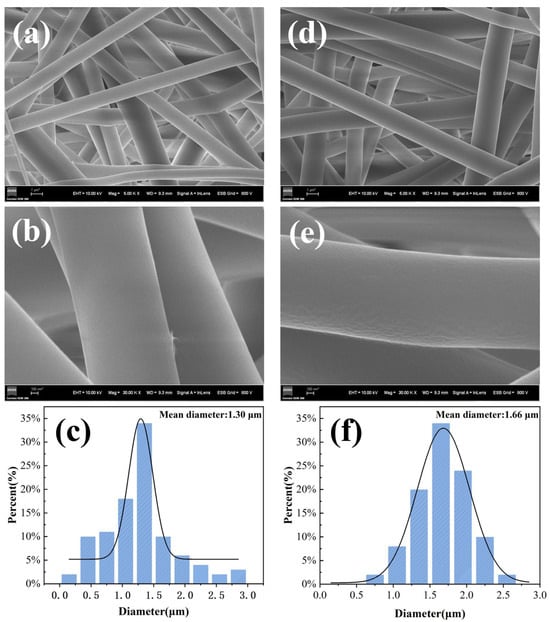 High- and low-power SEM images and diameter distribution of the fiber membrane before and after the addition of HBP-HTC, pure TPU fiber membrane: (a) low power, (b) high power, and (c) diameter distribution; HBP-HTC/TPU fiber membrane: (d) low power, (e) high power, and (f) diameter distribution.