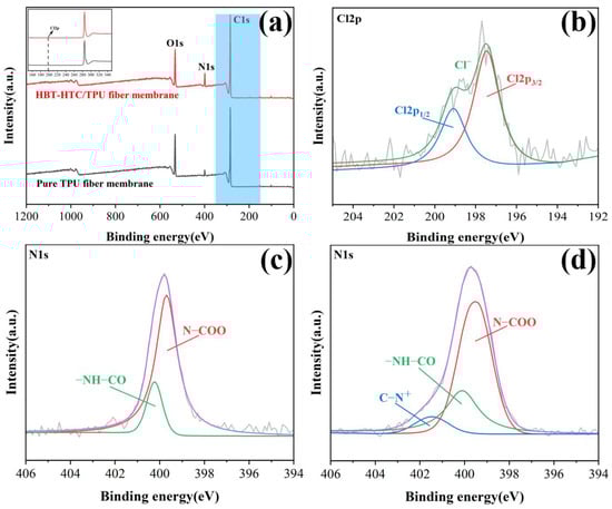 (a) XPS diagram of TPU fiber membranes before and after the addition of HBP-HTC, (b) Cl2p narrow spectrum diagram of HBP-HTC /TPU fiber membranes, (c) N1s narrow spectrum diagram of pure TPU fiber membranes, and (d) N1s narrow spectrum diagram of HBP-HTC /TPU fiber membranes.