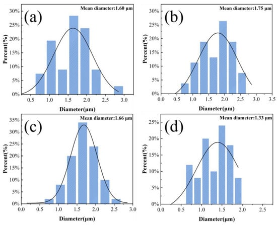 Diameter distribution of fiber membranes at different spinning voltages: (a) 18 kV, (b) 20 kV, (c) 22 kV, and (d) 24 kV.