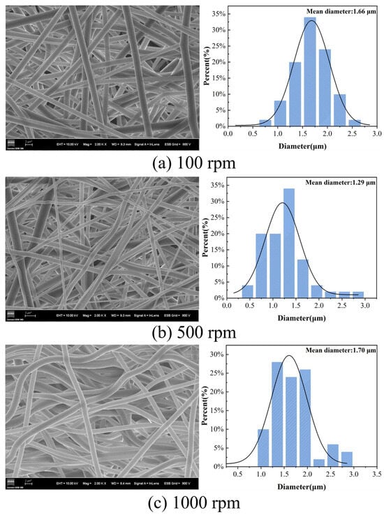 The SEM images and diameter distribution graphs of the fiber membranes prepared at different drum rotation speeds are shown in Figure 14. The diameter distribution statistics reveal that when the drum rotation speed increases from 100 to 500 rpm, the average fiber diameter decreases from 1.66 μm to 1.29 μm. It is proposed that the reduction in the fiber diameter is a consequence of the enhanced stretching of the jet at the same voltage, which is a result of the increased drum speed. However, the increased rotation speed also reduces the stability of the drum’s rotation, leading to increased fiber unevenness [37]. From the SEM image in Figure 14c, it is evident that when the speed is increased to 1000 rpm, the fibers become curved, and the overall fiber orientation is enhanced, resulting in further enlargement of the porosity. Additionally, the unevenness of the fibers is exacerbated. This occurs because adjusting the drum rotation speed under the same conditions can result in uniaxially oriented fibers; when the drum rotation speed exceeds the fiber deposition rate, curved fibers are obtained. At low rotation speeds, the fiber diameter distribution is concentrated, exhibiting an interwoven network structure; hence, 100 rpm was selected as the optimal drum rotation speed.