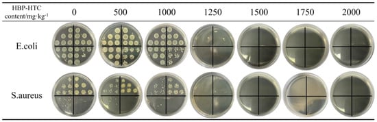 The antibacterial performance of the fiber membranes with HBP-HTC contents of 0, 1000, 1500, and 2000 mg/kg was evaluated in accordance with the revised GB/T 20944.3-2008 “Textiles—Evaluation of Antimicrobial Activity—Part 3: Oscillation Method [14]”, with the fiber membrane at 0 mg/kg serving as the blank control [25].