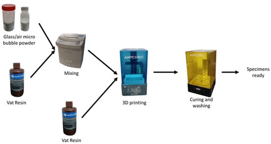 This study prepared two kinds of resin composites: resin glass powder (RGP) and resin air micro-bubbles (RMBs). Figure 1 shows the manufacturing process of the composite sample. The resin was obtained from Anycubic Basic Colored UV Sensitive Resin (Shenzhen Anycubic Technology Co., Ltd., Shenzhen, China), and the specification can be seen in Table 1. The shape composite sample dimensions can be seen in Figure 2. Glass powder and air micro-bubbles fillers were sourced from an Indonesian company (PT.Justus Kimia Raya, Semarang, Central Java, Indonesia). The specification of the glass powder can be seen in Table 2. The air micro-bubble average diameter is 50–100 μm. There was no other substance inside the air micro-bubble. The vat-resin was mixed with the powder fillers in varying concentrations from 1% to 5% wt, using a planetary mixer set at 1500 rpm for 5 min. The vat-resin composites with the fillers were then manufactured using an Anycubic Photon Mono SE printer (Shenzhen Anycubic Technology Co., Ltd., Shenzhen, China) and then washed and cured in a UV curing machine for 15 min to obtain fully clean and cured specimens to achieve the optimum polymerization. The printing parameters can be seen in Table 3. The number of samples tested for every specimen was 3.