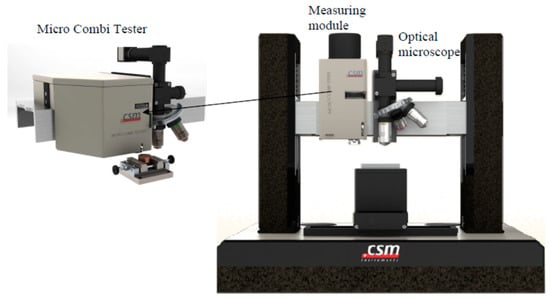 Surface investigation (including SEM pictures and EDX) of the samples was performed with a scanning electron microscope (SEM) Helios NanoLab 650 (FEI, Hillsboro, OR, USA). The multicycle scratch tests were conducted to see how each composite type reacts to a sliding steel ball (Ø3 mm) for 1000 cycles with a constant load increase from 0 to 30 N, 9 mm of scratch length, and 300 mm/min speed. The load was applied in both directions—backward and forward. Scratch testing was conducted with micro-combi scratch tester CSM (CSM, Peseux, Switzerland) (Figure 3).