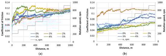 The friction measurement results at constant loading of 50 N at changing rotation speed for different filler concentrations of resin composite: (a) with glass powder; (b) with micro-bubbles.