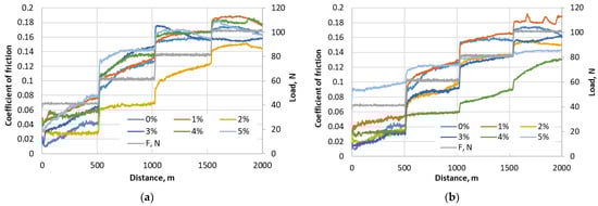 To evaluate how composites react to different loads in dry sliding conditions, a rotational speed of 500 rpm and load increment from 40 N to 100 N (step 20 N) regime were experimented. With each step, a 500 m run of dry sliding was performed. The total sliding distance was 2 km. The measurement results are presented in Figure 5.