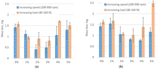 Wear measurement results when changing the rotation speed and loading for different filler concentrations of resin composite: (a) with glass powder; and (b) with micro-bubbles.