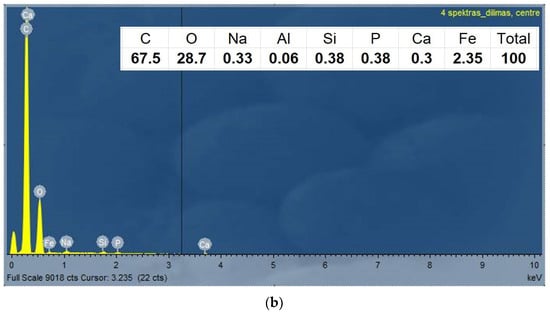 EDX surface analysis of the RMB sample of 4% concentration: (a) non-abraded surface; (b) the worn zone after the test. The elemental percentage does not present the quantitative values.