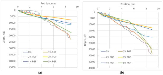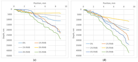 We can see that significantly smaller scratches remain on RGP composites rather than on RMB, both during the first and last cycle. The lowest (1%) and highest (5%) filler concentrations reduce the scratch resistance of the composites, resulting in deeper scratches. The same results are on both RGP and RMB samples, and that trend, which regards concentration and scratch depth, persists during all 1000 cycles. The highest resistance on scratch test presented the RGP samples of 3% and 4% of concentrations and RMB samples of 2% and 3% of concentrations. It passes the results of wear tests, which show the lowest wear of those optimal concentrations. The RGP sample of 3% concentration after 1000 cycles was scratched only for 12.8 µm in the deepest part. It was 60% less than the control version of the composite. The 3% RMB sample was scratched only for 11.7 µm showing 75% lower scratch depth compared to the control version.