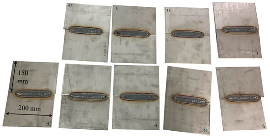 316 austenitic stainless-steel plates, with dimensions of 200 mm in length, 150 mm in width, and 3 mm in thickness, were used in this study. The chemical composition measured using the energy-dispersive X-ray fluorescence (EDXRF) method is shown in Table 1. Nine coupled plates were welded using the plasma arc welding process under the same conditions, as shown in Figure 1, for further processing.