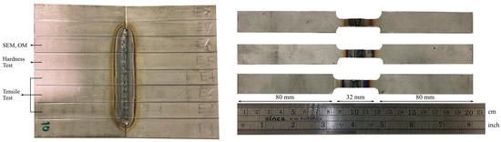 After undergoing the PWHT process, all the samples were prepared for mechanical properties testing. For the tensile test, the samples were cut into the standard dog bone shape in accordance with ASTM E8 specifications, as shown in Figure 2 and Figure 3. Three specimens were tested for each condition. The tensile test was conducted using a universal tensile machine (MTS, Eden Prairie, MN, USA) with a strain rate of 10−1/s.