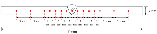 The Vickers hardness test measures a material’s property by calculating the hardness number from the load over the surface area of the indentation. When performing a hardness test, an initial force and the duration of the force are required. Firstly, the samples were sectioned into 50 mm lengths, as shown in Figure 4. The cut sections were then molded using a mixture of epoxy resin and hardening agent in a 2:1 ratio. Subsequently, sandpapers with grit sizes of 90, 120, 600, 800, and 1200 were used to smooth the cross-sectional surfaces. Final polishing was performed using a diamond paste. Evaluation points were marked on the polished samples, as illustrated in Figure 5, to prepare for testing. The Vickers hardness test was conducted with a load of 2.94 N and a dwell time of 15 s. The hardness values were measured ten times per sample, and the average value was calculated by excluding the maximum and minimum values.