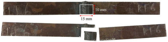 The samples were cut to a size of 15 mm in length and 10 mm in width, positioning the welded zone on the left side of the cut area, as shown in Figure 6. Distilled water, hydrochloric acid, and nitric acid were mixed in a ratio of 4:3:3 to create an etching solution. The samples heated to 650 °C were etched for 20 s, and the samples heated to 1050 °C were etched for 15 s. Afterwards, the microstructure of the samples was evaluated. A Scanning Electron Microscope (SEM) model MIRA4, produced by TESCAN (Brno, Czech Republic), and an Optical Microscope (OM) model BA310 MET, manufactured by MOTIC (Richmond, BC, Canada), were used.