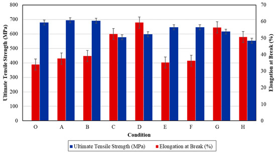 Tensile properties including ultimate tensile strength (UTS) and elongation at break were evaluated using a universal tensile machine. The values of each condition are displayed in Table 5 and graphed in Figure 7.
