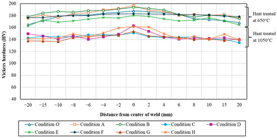 The differences in hardness values at each evaluated distance are presented in Table 7. Figure 8 illustrates the graphical variation of hardness in the weldment. Fifteen points were analyzed to explain the hardness of the weld zone, heat-affected zone, and base zone. It is observed that the weld area has the highest hardness value, which gradually decreases along the distance. The lowest value is found in the base zone on the right side of condition C. Additionally, the lowest hardness for every sample is found in the base zone at the point farthest from the center of the weld. Considering the differences influenced by temperature, the hardness values are significantly reduced when heat-treated at higher temperatures (1050 °C) and quenched in both water and air. This indicates that the high temperature, nearly the melting point of 316 stainless steel, is too high to maintain hardness. Among the quenching media, it is found that the trend changes similarly to one another. The highest hardness value is observed in the workpiece heated at 650 °C for an hour, water-quenched, and aged at 500 °C for 24 h, which is caused by precipitation and crystallization. Different phases are exposed in this condition. The heat treatment time also trivially affects the workpiece. However, the most influential factor is temperature, which affects the hardness of the workpiece. It can be concluded that temperature has an important effect on the hardness properties of materials.