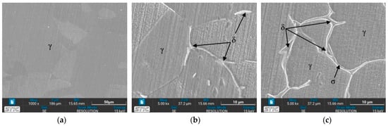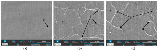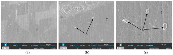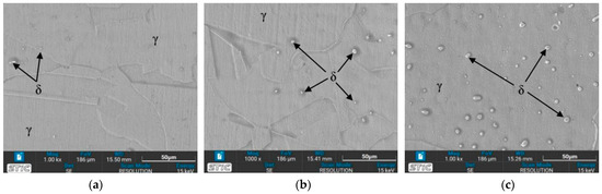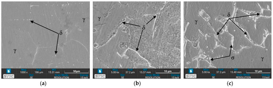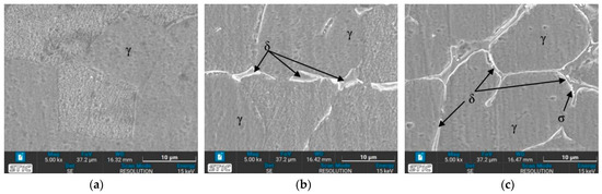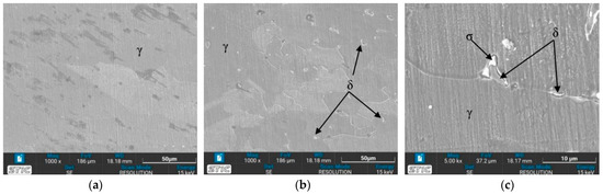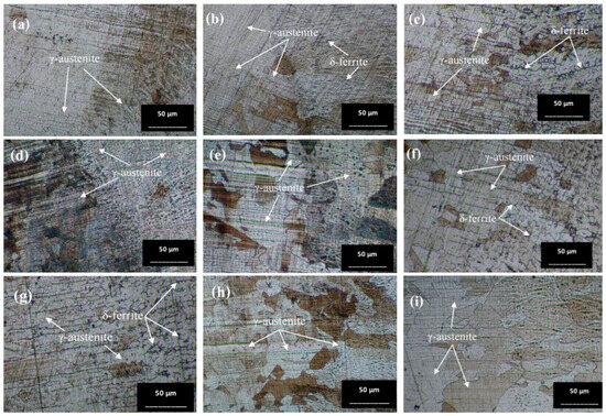 In the heat-affected zone (HAZ), a phase transformation from γ phase to δ phase is initiated, as evidenced by the presence of some dendritic δ phase, particularly under the conditions of a solid solution temperature of 650 °C (conditions A, B, E, and F), as depicted in Figure 10. Notably, no δ phase is observed in the as-welded sample. The prevalence of the δ phase is higher at 650 °C compared to 1050 °C, especially in condition A. It is observed that the δ phase in the HAZ exhibits a more orderly alignment. Quenching in water results in a finer grain size of the austenite phase. Furthermore, Figure 10 illustrates the grain growth of austenite with increasing time and temperature. Figure 10i demonstrates significant grain growth, attributed to the accelerated thermally assisted migration of the austenite grain boundaries. The high temperature markedly influences the grain size, as evidenced by the comparison between Figure 10c,i.