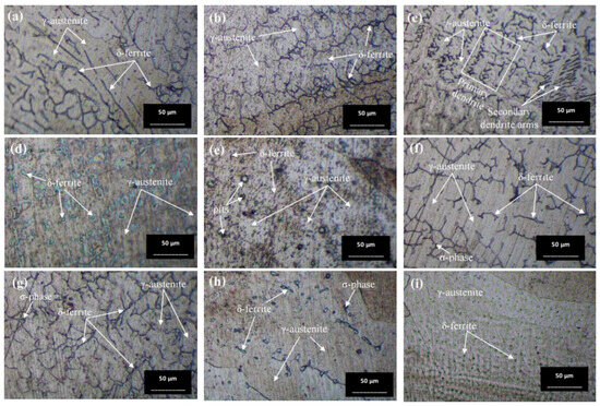 Optical micrographs of heat-affected zone (HAZ) of (a) as-welded, (b) condition A, (c) condition B, (d) condition C, (e) condition D, (f) condition E, (g) condition F, (h) condition G, and (i) condition H.
