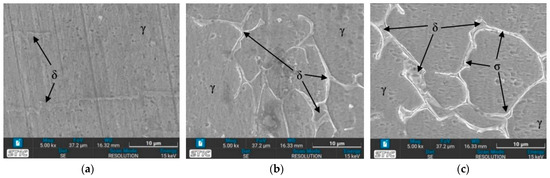 Figure 11 illustrates the microstructure of the welded zone under all conditions. In this weld zone, it was observed that the δ phase decomposed to a two-phase structure of sigma and secondary γ through eutectoid decomposition [35]. A significant portion of the δ phase dissolves in this zone. Figure 11b,c,g,h show obviously the presence of the dendritic δ phase within the austenitic matrix [36]. When tempered at 650 °C, the microstructure exhibits more dendritic branches compared to the as-welded condition (Condition O). The dendritic δ structure suggests that the specimen’s structure at the weld zone is stronger than that of the base zone [37]. This is attributed to the large grainy surface area of each dendrite, where individual branches collide, preventing further crystal formation. Additionally, the amount of δ phase is directly related to the hardness values [38], with Figure 11b or condition A supporting the highest hardness value due to its numerous orderly dendritic δ phases reported previously. Mária Dománková et al. [39] reported that a significant etching of grain boundaries occurs with increased holding time at high temperatures, caused by the precipitation of secondary phases at the grain boundaries. A few particles of the σ-phase were detected at the grain boundaries in several conditions, as indicated by the arrows.