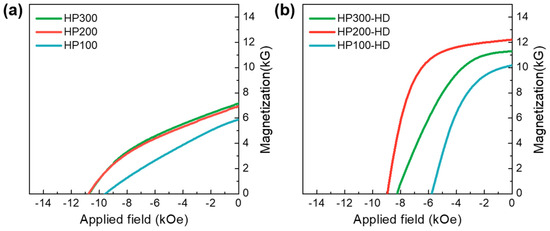 Figure 1a shows the magnetic hysteresis loops measured for hot-pressed precursors prepared under various pressures. The magnetic properties of the isotropic sintered body, specifically remanence (Br) and coercivity (Hci), exhibited an increase as the pressure escalated from 100 MPa to 300 MPa. The relative density of the sintered precursors obtained through hot-pressing at 100 MPa was only 89%, as shown in Table 1. However, precursors hot-pressed at 200 and 300 MPa demonstrated a significantly higher relative density, reaching up to 98%. The elevated pressure in the hot-pressing step contributed to an increase in the density and volume of the crystalline hard magnetic RE2Fe14B phases, thereby enhancing magnetic properties [24]. Despite having the same density, there were observable differences in the magnetic properties of HP200 and HP300 after undergoing hot deformation. The magnetic properties of final (Nd0.6Ce0.4)–Fe-B hot-deformed magnets are presented in Figure 1b and Table 1. After hot deformation, all specimens exhibited an increase in remanence and a decrease in coercivity.