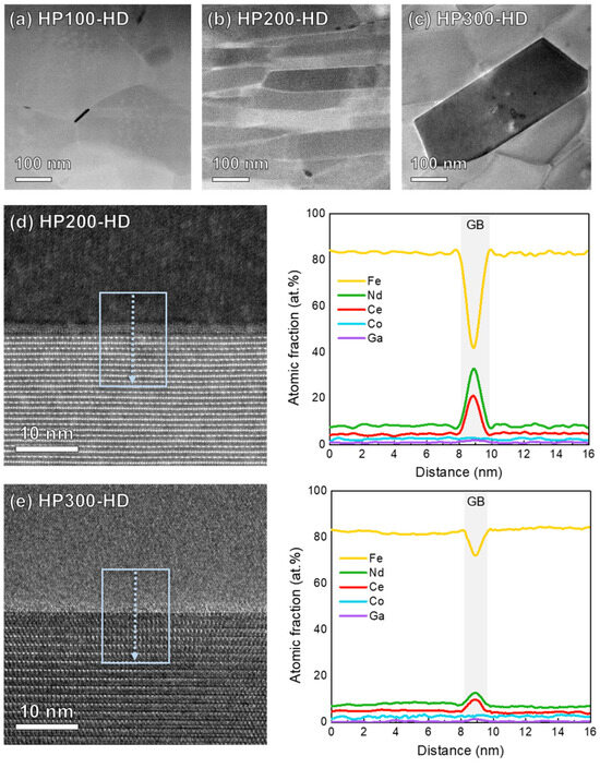 Figure 5 presents high-magnification ABF-STEM images of the grain boundary of the hot-deformed magnets. In Figure 5a, misoriented grains with blurry boundaries are observed. Conversely, in the case of HP200-HD shown in Figure 5b, a uniformly distributed RE-rich grain boundary phase and well-aligned anisotropic grains are evident. In Figure 5c, coarsened grains exhibiting orientation distortion were observed due to non-uniform grain boundaries caused by the agglomerated h-RE2O3 secondary phase. Line-scan profiles obtained from the RE-rich grain boundary phase formed on the c-plane of the RE2Fe14B platelets of HP200-HD and HP300-HD are shown in Figure 5d,e. The RE concentration of the grain boundary phase in the HP200-HD (Nd+Ce = 54.02 at.%) is much higher than that of HP300-HD (Nd + Ce = 20.37 at.%). Generally, as the substituted content of Ce increases, the REFe2 secondary phase is formed, which consumes excess RE [21]. The formation of the REFe2 phase decreases the concentration of paramagnetic Nd and Ce in the RE-rich grain boundary phase in the final hot-deformed magnets, thereby suppressing the exchange decoupling between adjacent RE2Fe14B grains. In this study, both the HP200-HD and HP300-HD effectively suppressed the REFe2 secondary phase; however, in the case of HP300-HD, excessive formation and agglomeration of h-RE2O3 phase at triple junction resulted in decreased RE concentration at the grain boundaries. As a result, HP200-HD with high paramagnetic Nd and Ce in the RE-rich grain boundary phases effectively suppressed the exchange coupling and resulted in higher coercivity.