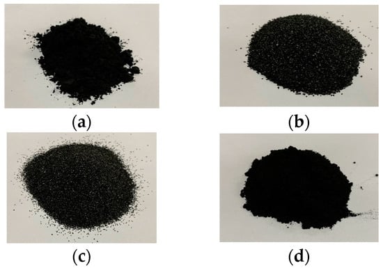 Photographs of carbon materials used as expansive agents in this study: (a) oak charcoal, (b) palm charcoal, (c) broadleaf charcoal, and (d) expanded carbon.