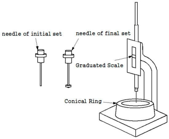 The setting time of the grout was measured according to KS L ISO 9597 (The method of testing the setting and soundness of cement) [], as shown Figure 2. The experimental environment was maintained at a temperature of 20 ± 2 °C and a humidity of 90% or higher. Measurements were performed at 15-min intervals from the beginning of the measurement until the initial setting. Subsequent measurements were performed at 10-min intervals until the final setting.