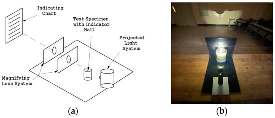 To examine the pre-hardening shrinkage/expansion of the grout, it was poured into a Ø 100 × 200-mm acrylic mold. Next, measurements were performed by shining a light from the light source lens and utilizing the enlarged shadow, as shown in Figure 3, in accordance with the specifications of ASTM C 827 (standard test method for change in height at early ages of cylindrical specimens of cementitious mixtures) []. The experimental environment was maintained at a temperature of 20 ± 2 °C and a humidity of 60% ± 5%. Measurements were performed at 5-min intervals from the beginning of the measurements until 90 min, at 10-min intervals from 90 min to 150 min, and at 20-min intervals thereafter until the final setting. After the final setting, measurements were performed at 60-min intervals until the end of the 24-h period.