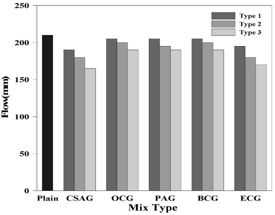 The fluidity test results of the grouts are shown in Figure 5. The flow of Plain was 205 mm, whereas that of CSAG was 190, 180, and 165 mm. Hence, the fluidity decreased as the amount of CSA mixed with grout increased. It was determined that the fluidity of the grout decreased because its viscosity increased due to the high fineness of CSA. In addition, the flow of the grouts mixed with carbon materials is as follows: OCG—205, 200, and 190 mm; PAG—205, 195, and 190 mm; BCG—205, 200, and 190 mm; and ECG—195, 180, and 170 mm. These results showed a tendency for the fluidity to decrease as the amount of carbon materials mixed with grout increased. In the case of the carbon materials with porous structures, it was determined that the moisture absorption rate increased as the mixing ratio increased, which decreased the fluidity [,,,].