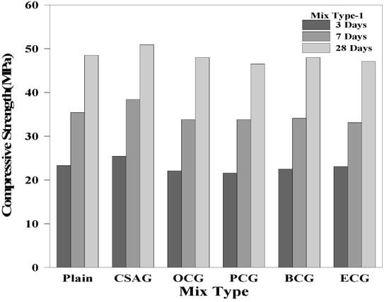 Compressive strength of mix type 1 by age.