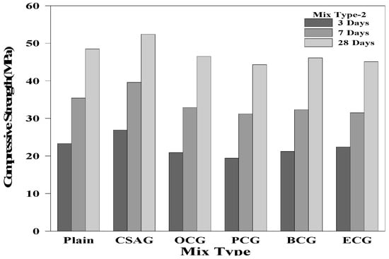 Compressive strength of mix type 2 by age.