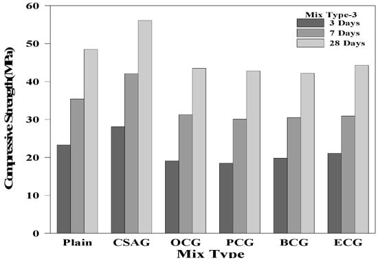 Compressive strength of mix type 3 by age.