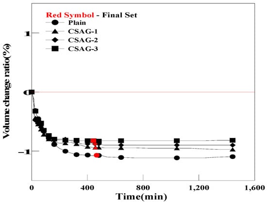 Figure 9 shows the pre-hardening shrinkage and expansion rates of grout for each mixing ratio of CSA. In the case of Plain, a volume change of −1.07% was observed at the final setting point of grout. For CSAG, volume changes of −0.94%, −0.88%, and −0.82% were observed, depending on the mixing ratio of CSA. As the mixing ratio of CSA increased, the pre-hardening shrinkage of the grout tended to slightly decrease. It was believed that, as the amount of CSA used in the grout increased, the internal moisture was consumed, which reduced the shrinkage of the grout. Moreover, compared with Plain, the difference in the volume changes of CSAG before hardening was insignificant. It was inferred that the ettringite generated by the chemical reaction of CSA did not effectively compensate for the plastic shrinkage that occurred within several minutes to hours during hardening [].