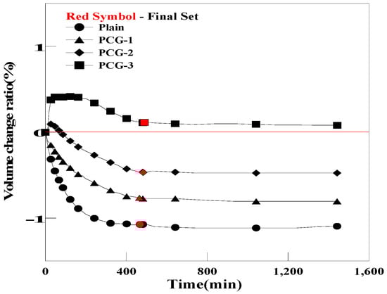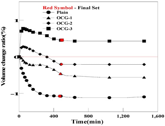 Figure 10 and Figure 11 show the pre-hardening shrinkage/expansion of the grout for each mixing ratio of OC and PC. In the case of OCG, volume changes of −0.43%, −0.20%, and 0.45% were observed, depending on the mixing ratio of OC. For PCG, volume changes of −0.76%, −0.46%, and 0.11% were observed, depending on the mixing ratio of PC. OCG-3 and PCG-3 (a mixing ratio of 0.5% for both OC and PC) expanded more than the initial volume of Plain. This improvement in the expansion performance was achieved because porous carbon materials such as OC and PC absorb moisture when the grout is mixed, and the air contained inside is released, creating bubbles within the grout.