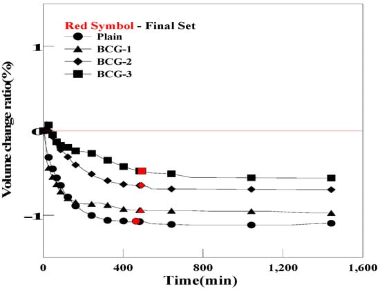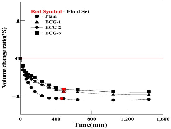However, as shown in Figure 12 and Figure 13, the grouts mixed with BC and EC exhibited a reduction in the pre-hardening shrinkage. However, volume changes were insignificant compared with those of OCG and PCG []. This result can be attributed to the fact that carbon materials with porous structures generate different amounts of bubbles based on the carbon material used, due to differences in the number of micropores and pore size.