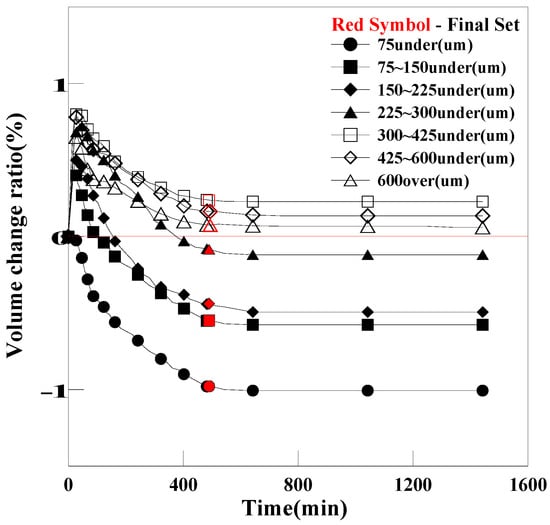 To examine the expansion efficiency according to the size of the OC material, seven particle sizes were selected and mixed with the grout. The grout mixed with different particle sizes of OC material is shown in Table 5. The shrinkage/expansion test was conducted on the grouts mixed with the expansive agents of each particle size, and the test results are shown in Figure 15. Particle sizes ranging from less than 75 µm to greater than or equal to 600 µm were examined, and the results showed a tendency for the expansion performance to decrease as the size of the material decreased. The expansion effect was reduced because as the size of the material decreased, the number of pores contained per unit particle was reduced during the grinding process for each material size. The most effective size was found to be between 300 and 425 µm. The expansion test results showed that OC size 2 (≥425 µm) was less effective than OC with particle sizes ranging from 300–425 µm. Hence, it was inferred that there is a limitation on the particle size.