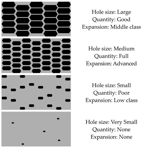 Therefore, the expansion performance of the carbon materials varied according to the size, number, and length of the pores. The size and number of pores were compared, and four representative shapes were schematically illustrated, as shown in Figure 16 below.
