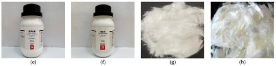 Raw materials of EGC: (a) fly ash; (b) ground granulated blast furnace slag; (c) quartz powder; (d) sodium silicate; (e) sodium hydroxide; (f) barium chloride; (g) polyethylene fiber; (h) polyvinyl alcohol fiber.